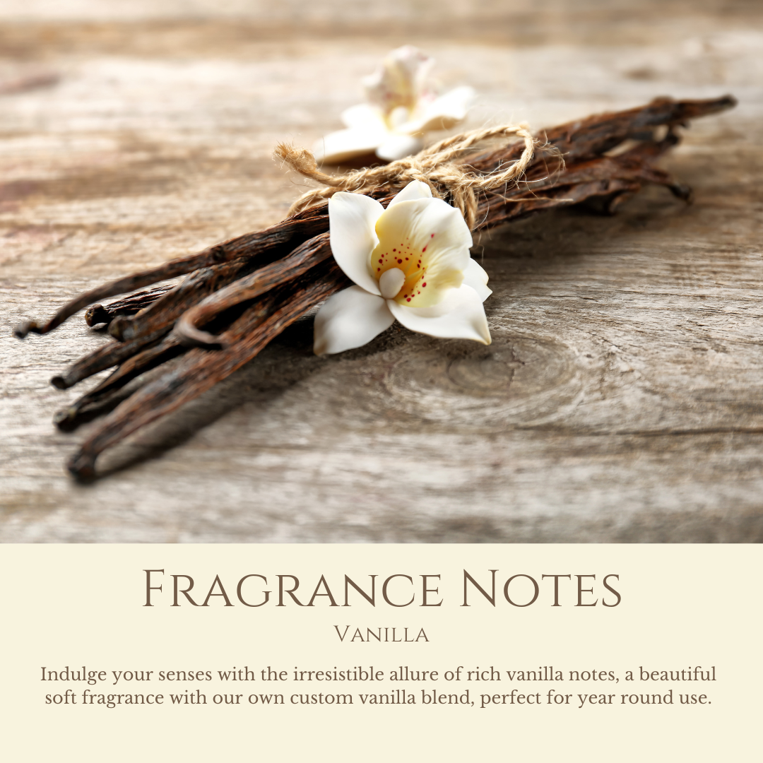 A beautiful soft fragrance with our own custom vanilla blend, perfect for year round use.