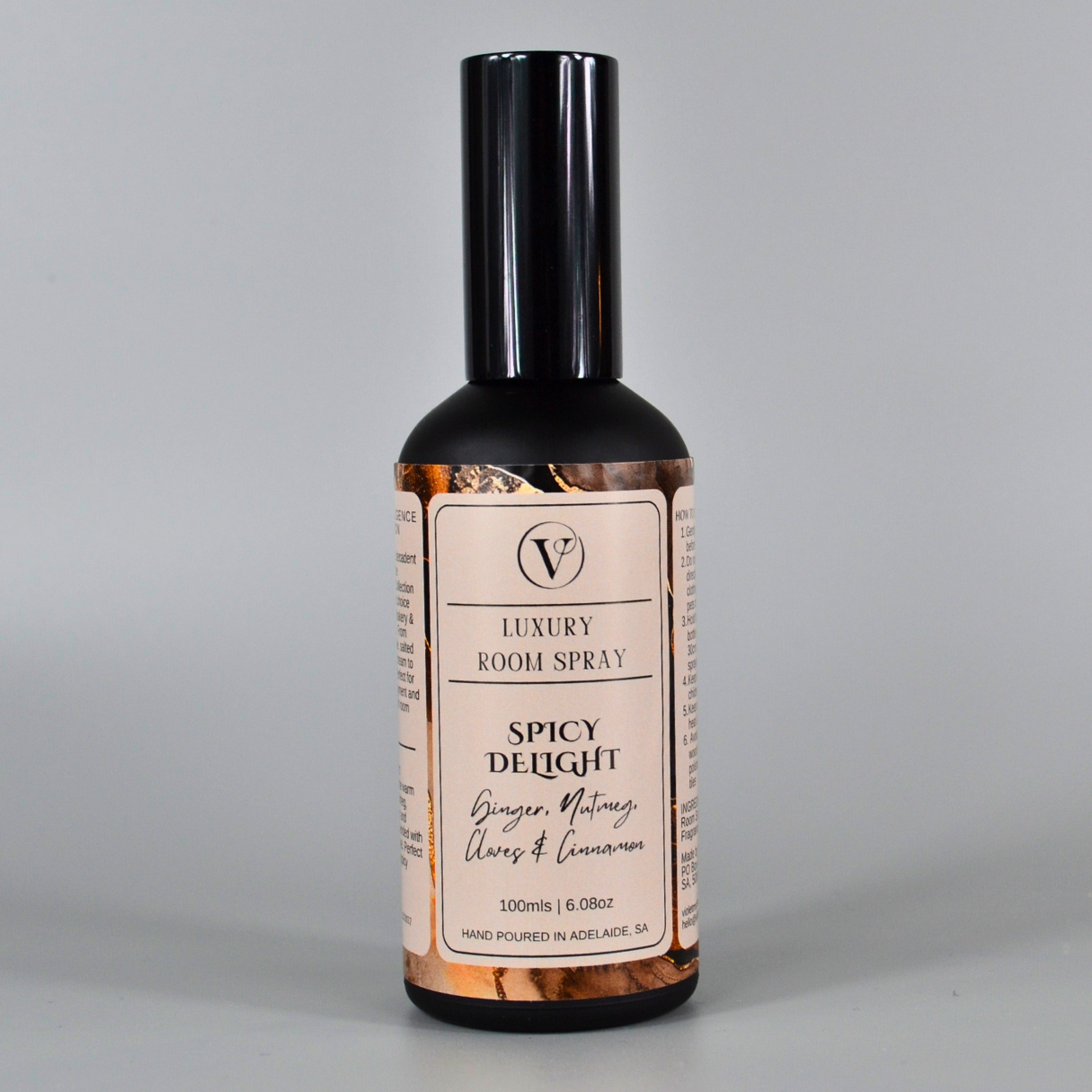 Our 100ml Room Sprays are designed to bring a touch of luxury to your living spaces. Each spray is hand poured in small batches in our Adelaide Studio. Our room sprays are carefully formulated with eco-friendly, biodegradable ingredients, ensuring they are free from harmful chemicals. Packaged in an elegant matte black glass bottle and accompanied by a coordinating black box.