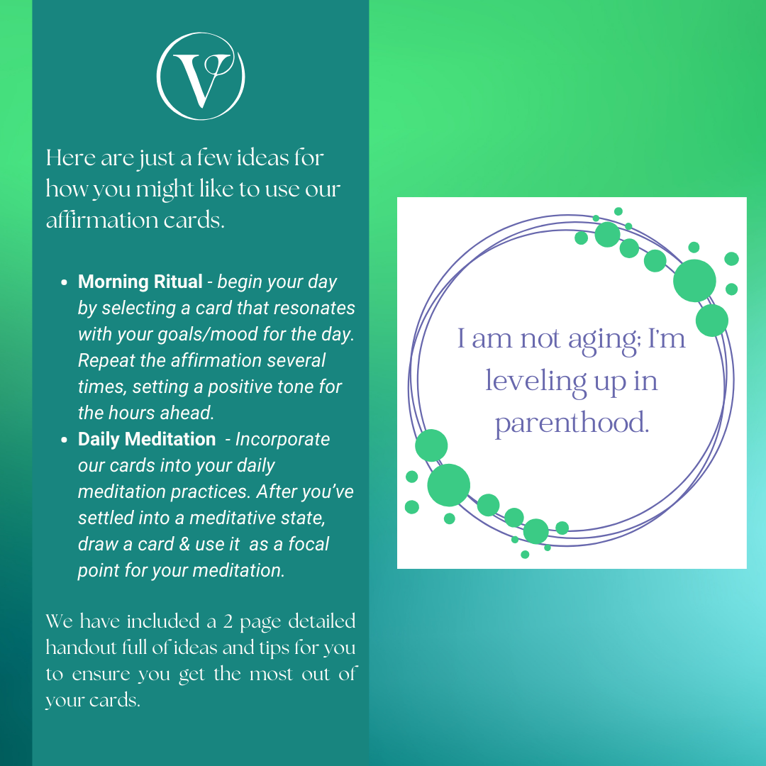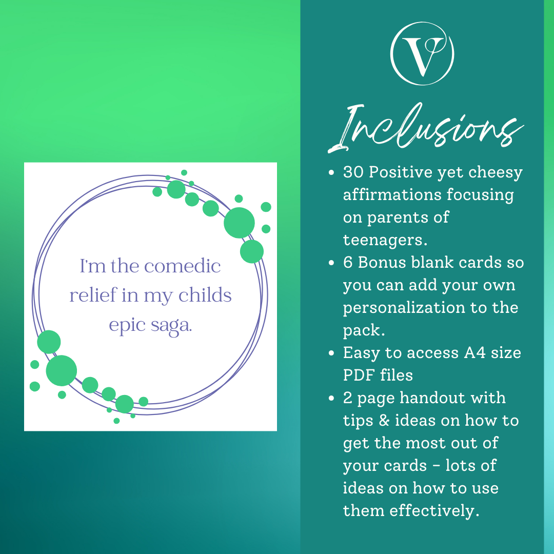 A fun and uplifting set of 30 affirmation cards blending humor and encouragement for parents navigating the teenage years, plus 6 blank cards for personalization.