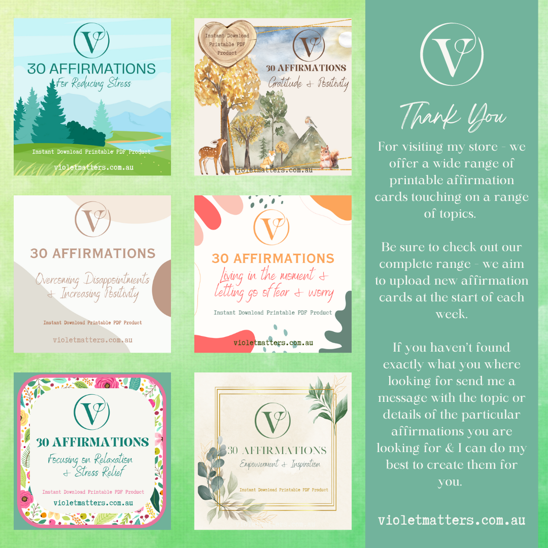 Support your journey through change with 36 printable affirmations designed to uplift, motivate, and provide comfort during lifeβs transitions. Includes 4 blank cards for personalisation. Perfect for embracing new beginnings with confidence. Print on quality cardstock. For personal use only.
