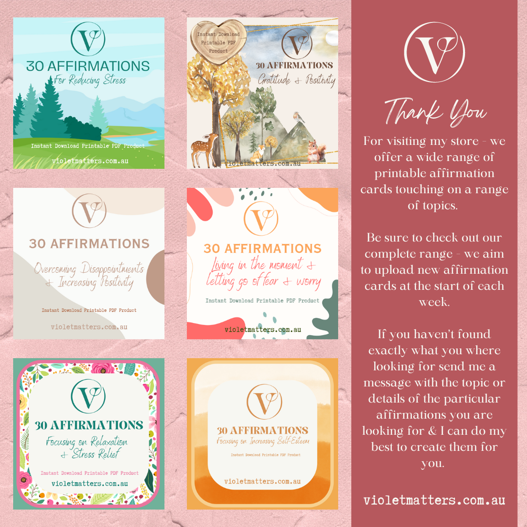 Support your mental and emotional well-being with this printable set of 30 uplifting affirmation cards, plus 4 blank cards for personalisation. Each card is designed to inspire self-love, calm, and daily positivity—ideal for journaling, mindfulness, or a thoughtful gift.