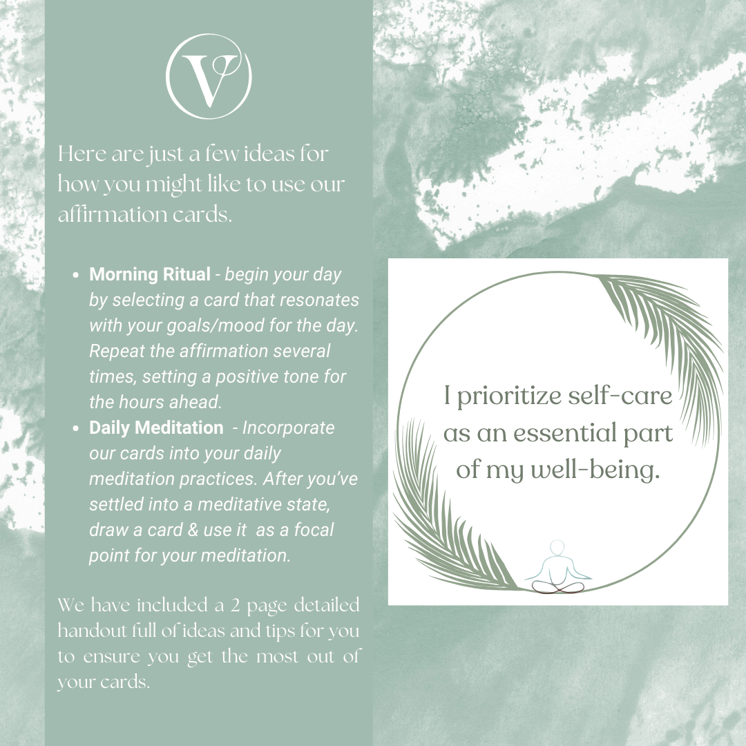 A set of 36 uplifting affirmations designed to support relaxation, stress relief, and wellness, plus 6 blank cards for personalization.