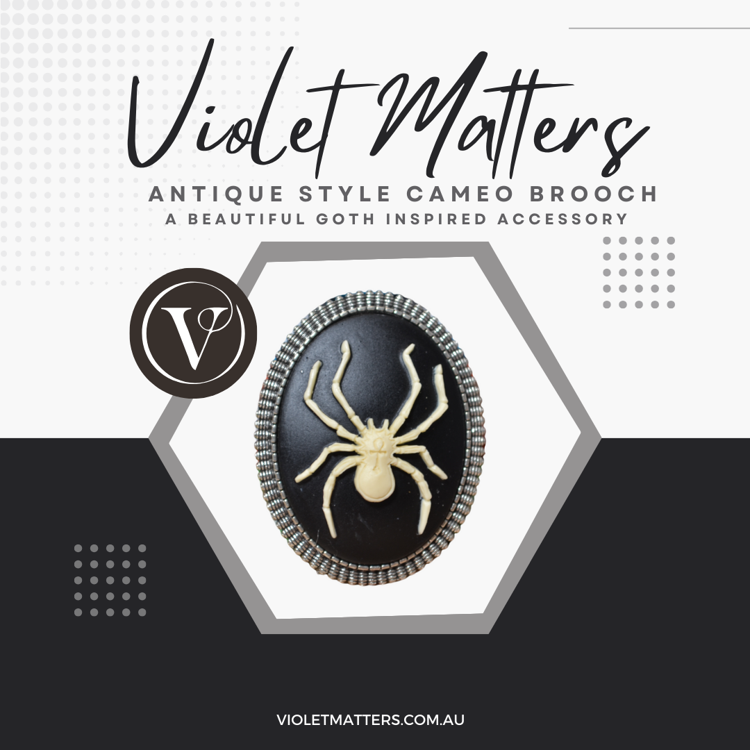 Featuring a striking cream spider in raised detail on a black resin base, the cameo is set in an antique-style silver-plated frame, combining Gothic charm with vintage sophistication. Perfect for those seeking a distinctive accessory that stands out while honoring the elegance of the Victorian era. Each piece in this collection is designed to offer something truly special, avoiding the mass production of modern jewelry.