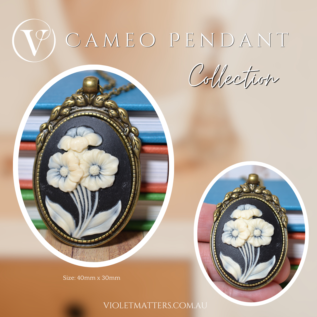 Are you looking for something a little different and special? This particular cameo pendant necklace has been set within an antique bronze plated frame and features a flower scene set on a black resin base - which would be great to wear all year round.