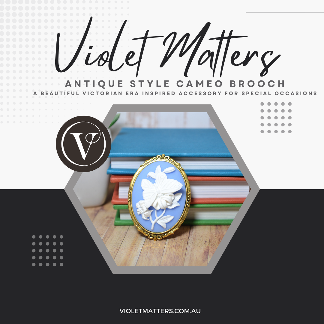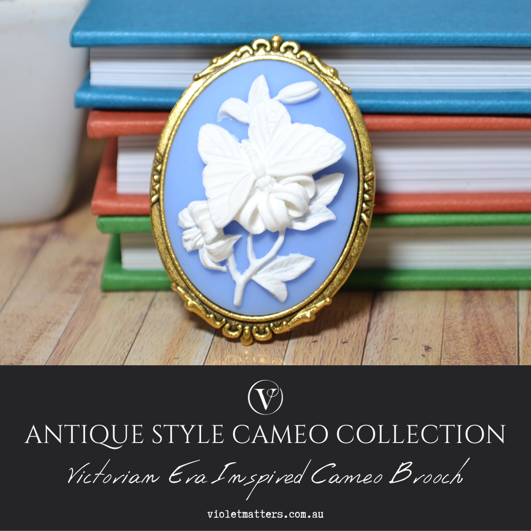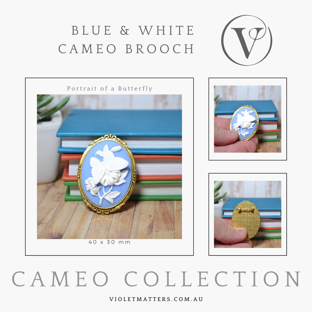 Are you looking for something a little different and special? This particular cameo brooch has been set within an antique gold plated frame and features a white raised butterfly mounted on a blue resin base.