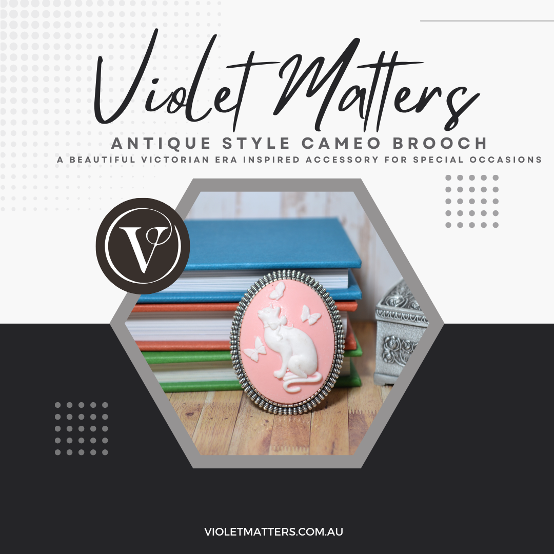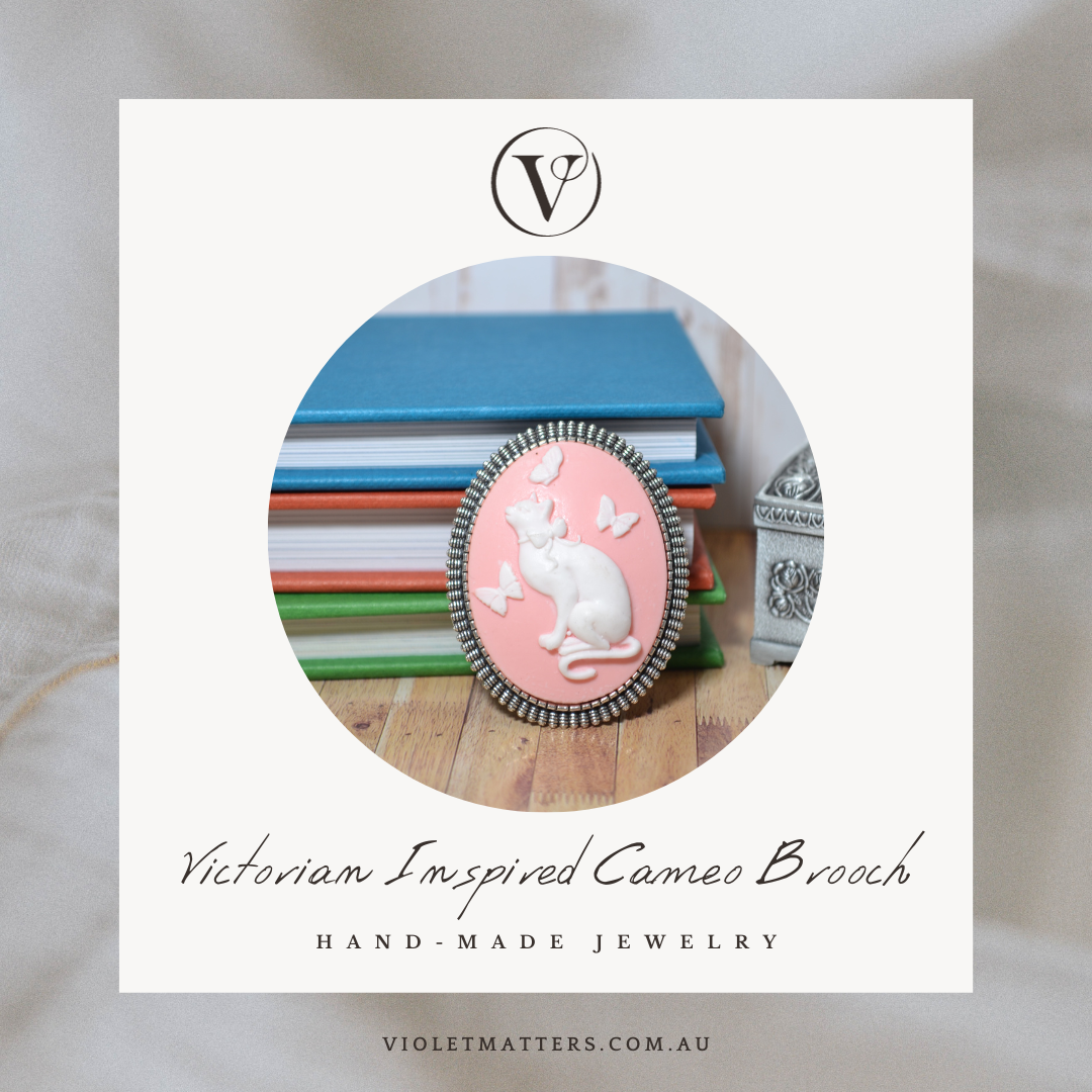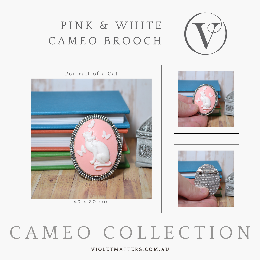 Are you looking for something a little different and special? This particular cameo brooch has been set within an antique silver plated frame and features a white raised cat and butterflies mounted on a pastel pink resin base.