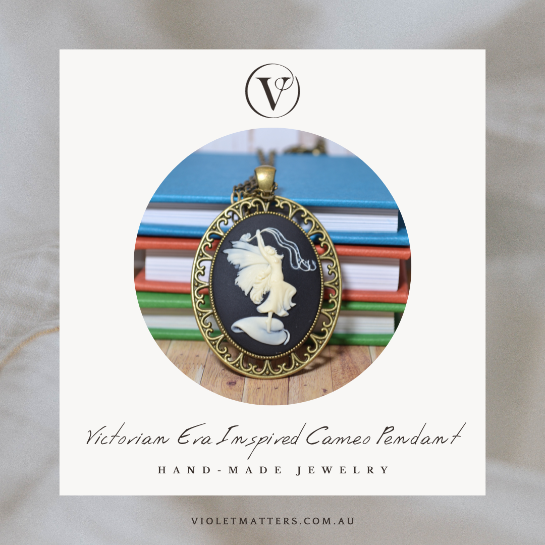 Are you looking for something a little different and special? This particular cameo pendant necklace has been set within an antique bronze plated frame and features a cream ribbon dancing fairy set on a black resin base.