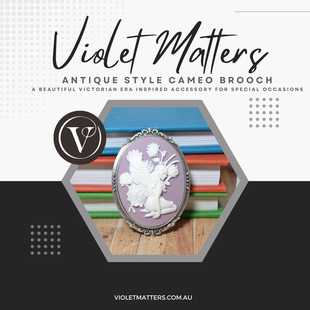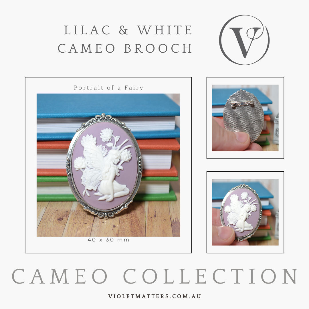 Are you looking for something a little different and special? This particular cameo brooch has been set within an antique silver plated frame and features a white raised woodland fairy mounted on a lilac resin base.