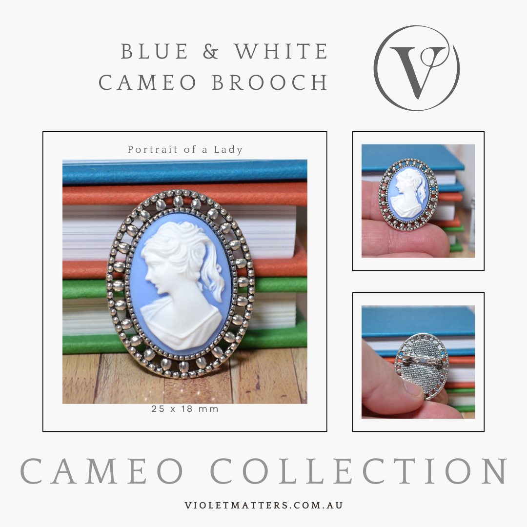 Are you looking for something a little different and special? This particular cameo brooch has been set within an silver plated frame and features a white raised women in profile mounted on a blue resin base. Please note that the size described is for the complete cameo - including the setting - not just the size of the cabochon which is 25x18mm.