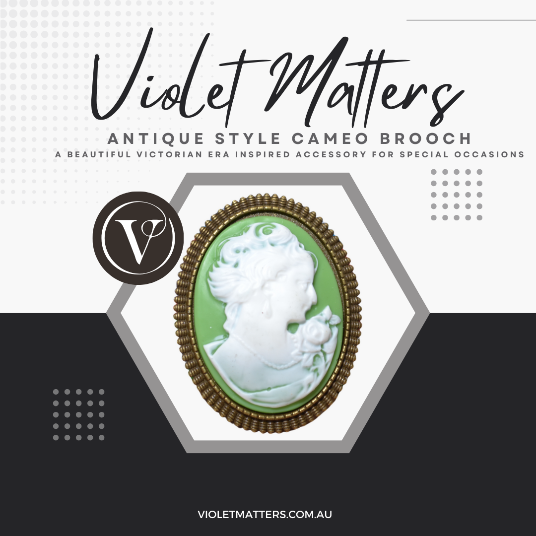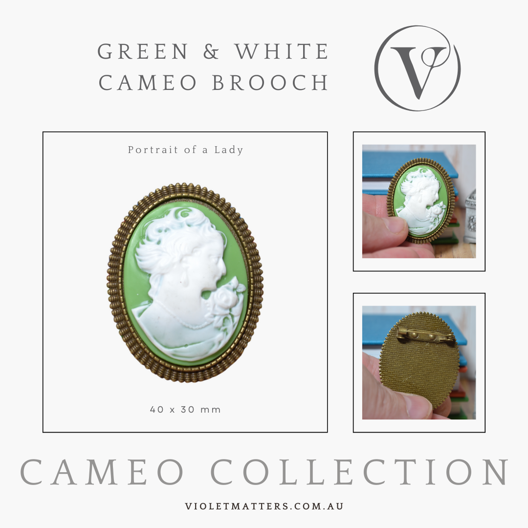 Are you looking for something a little different and special? This particular cameo brooch has been set within an antique bronze plated frame and features a vintage style women in profile with short hair in white resin, that has been set within a green resin base.