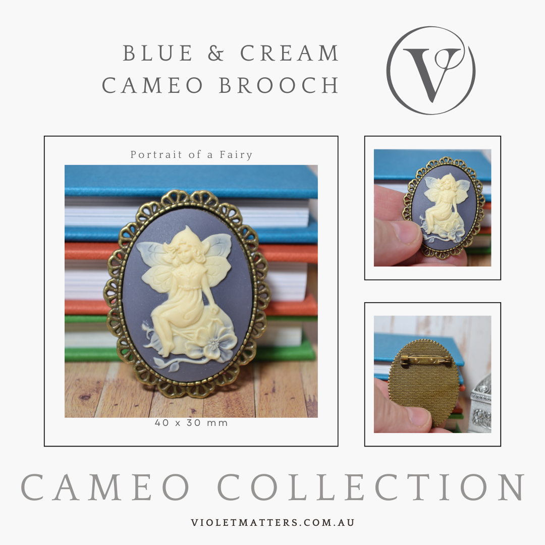 Are you looking for something a little different and special? This particular cameo brooch has been set within an antique bronze plated frame and features a cream raised woodland fairy mounted on a blue resin base.