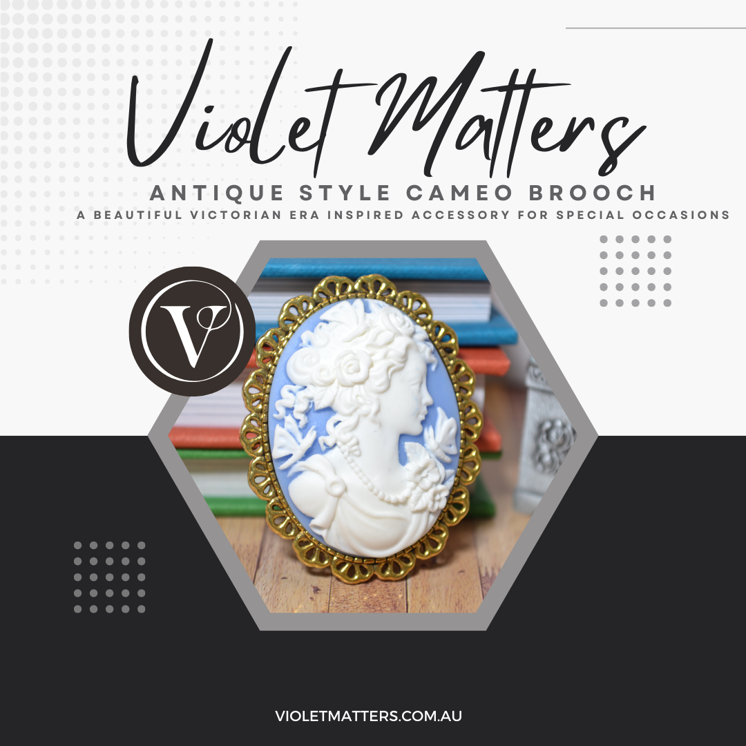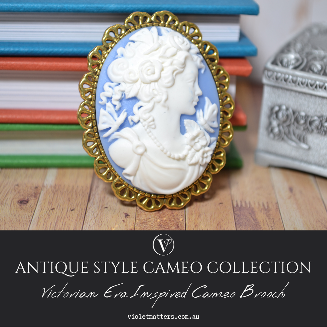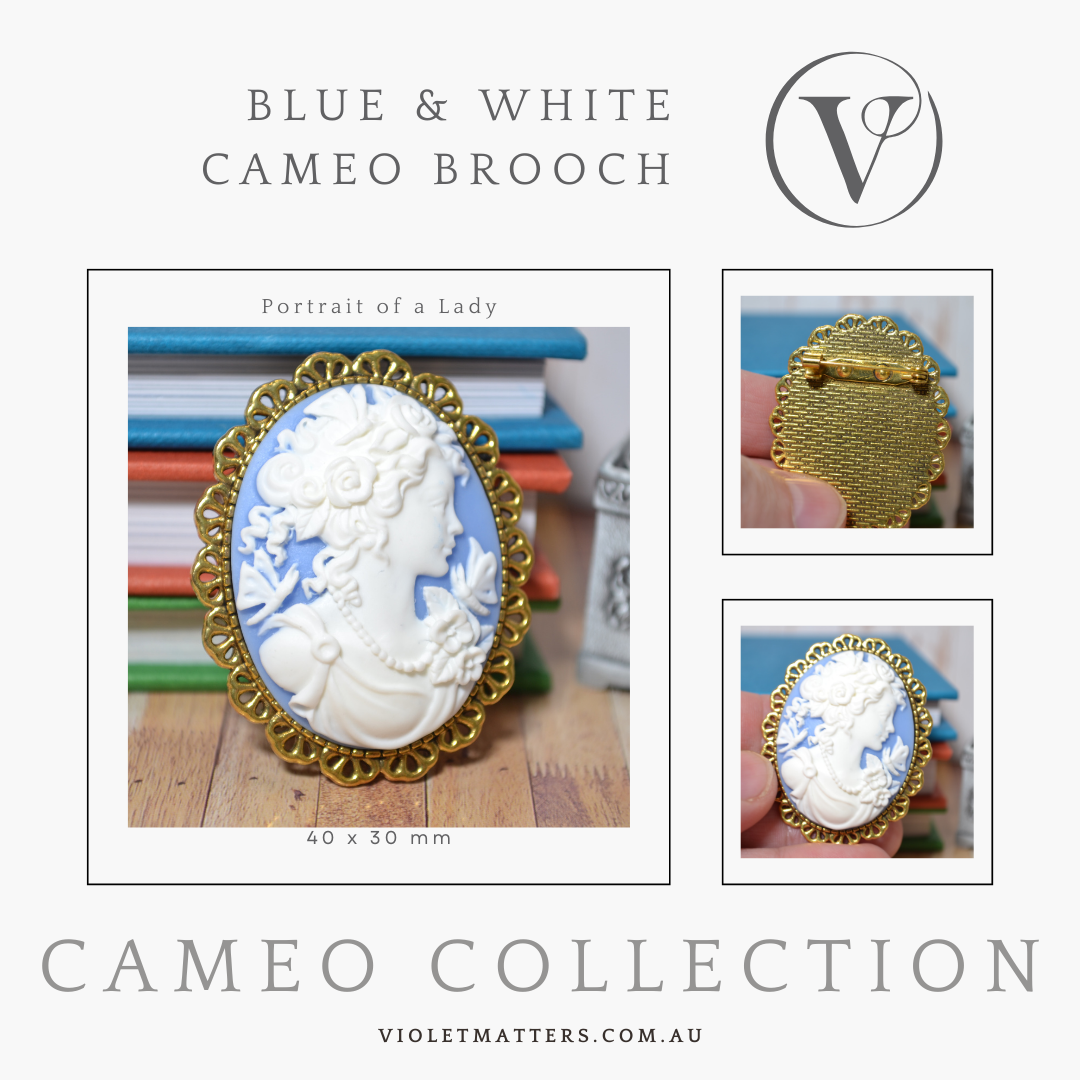 Are you looking for something a little different and special? This particular cameo brooch has been set within an antique gold plated frame and features a vintage style women in profile with flowers in her hair, wearing pearls with butterflies flying around her, in white resin, that has been set within a blue resin base.