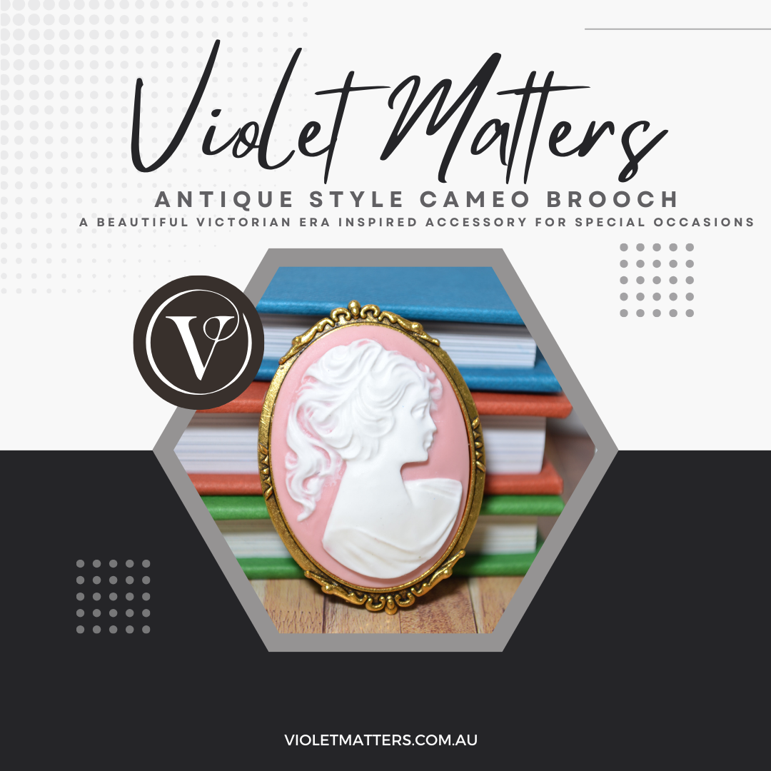 Are you looking for something a little different and special? This particular cameo brooch has been set within an antique gold plated frame and features a vintage style women in profile with her hair in a pony tail in white resin, that has been set within a pastel pink resin base.