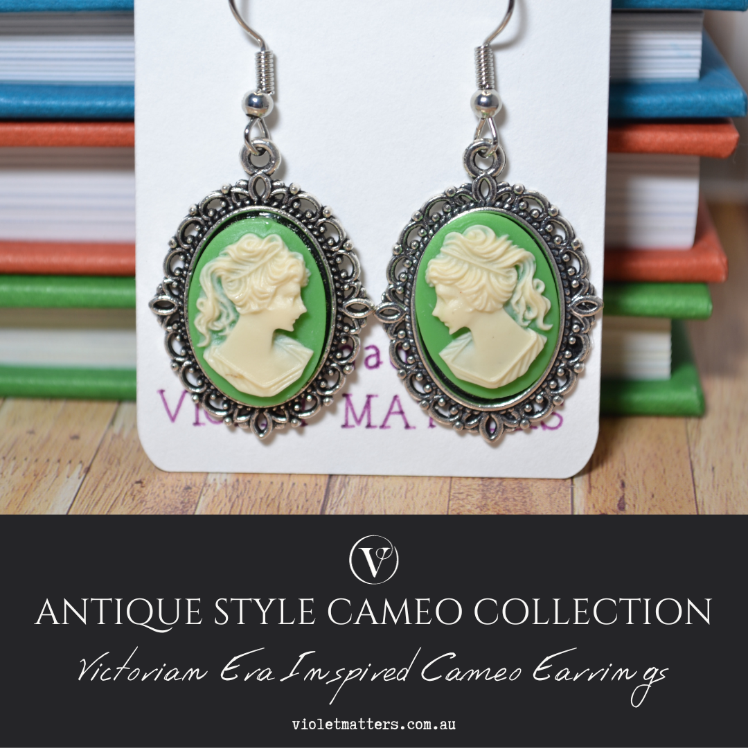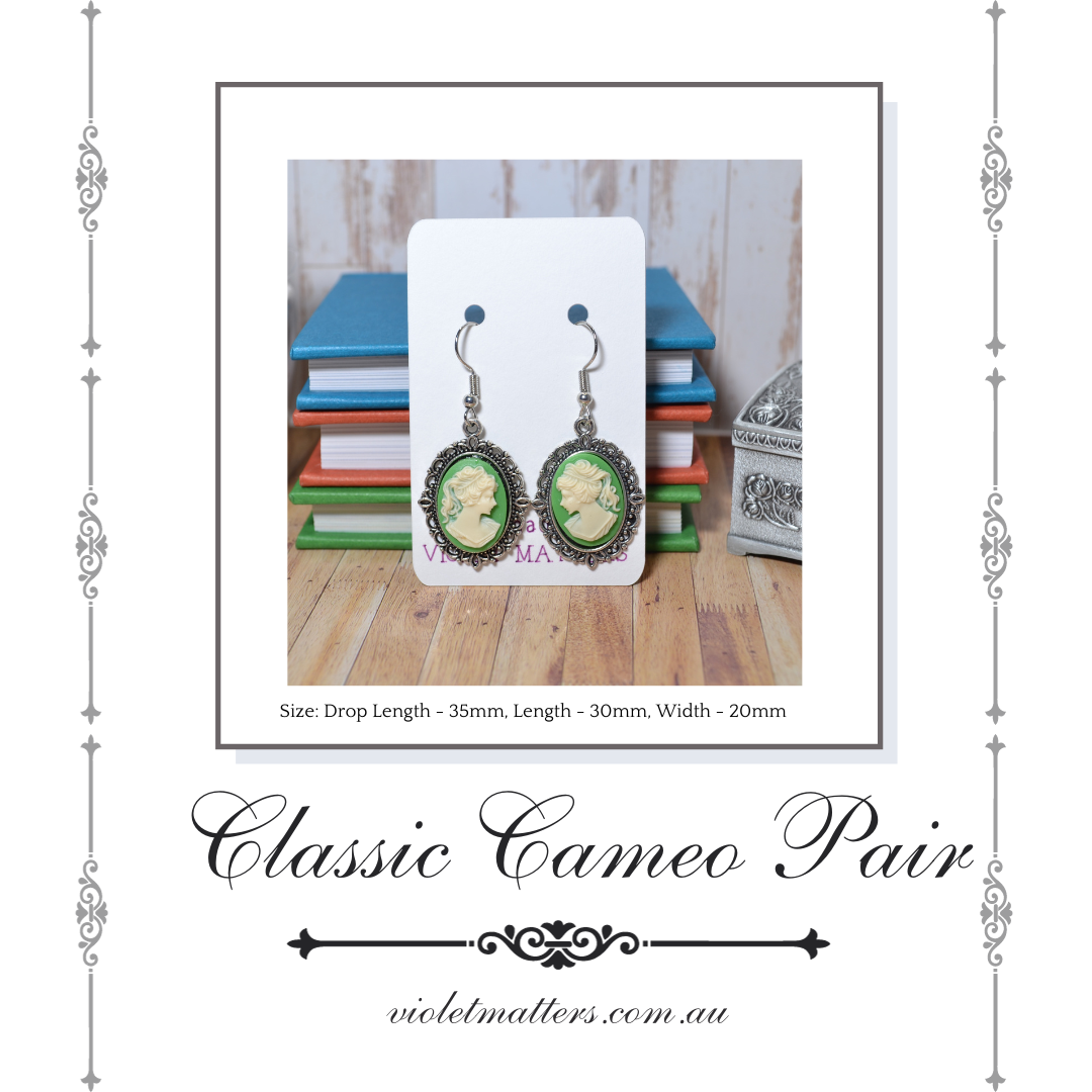 Discover a unique and elegant accessory with these Victorian-inspired antique style cameo earrings. Each earring features a cream-colored woman-in-profile design, raised on a green resin base and set within a silver-plated frame. The detailed craftsmanship ensures a timeless look. Please note, the size provided refers to the complete cameo, including the silver-plated setting, while the cabochon itself measures 18x13mm.