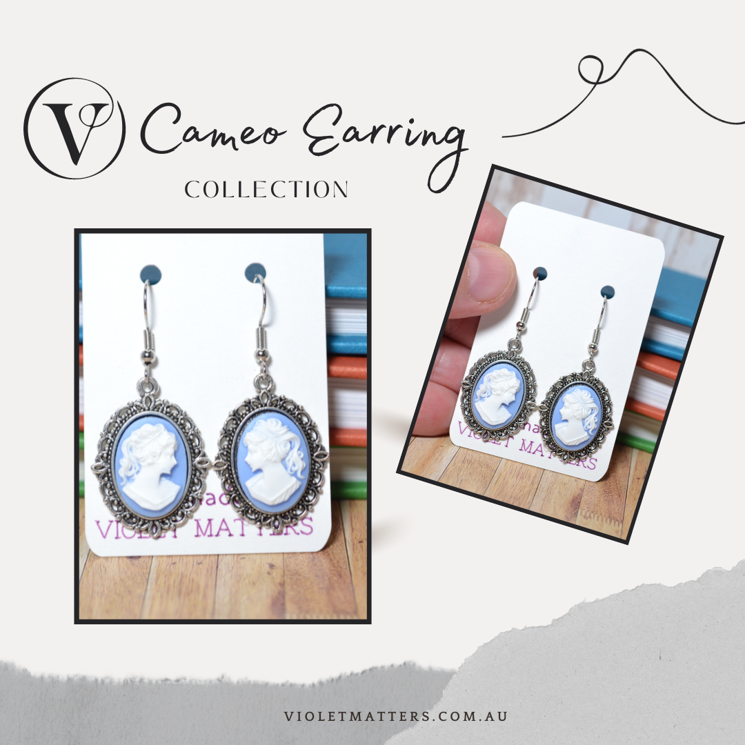 These classic cameo earrings feature a white woman-in-profile design raised on a blue resin base, elegantly set in a silver-plated frame. A timeless accessory with vintage appeal. Please note, the size provided includes the entire cameo with the silver-plated setting, while the cabochon measures 18x13mm.