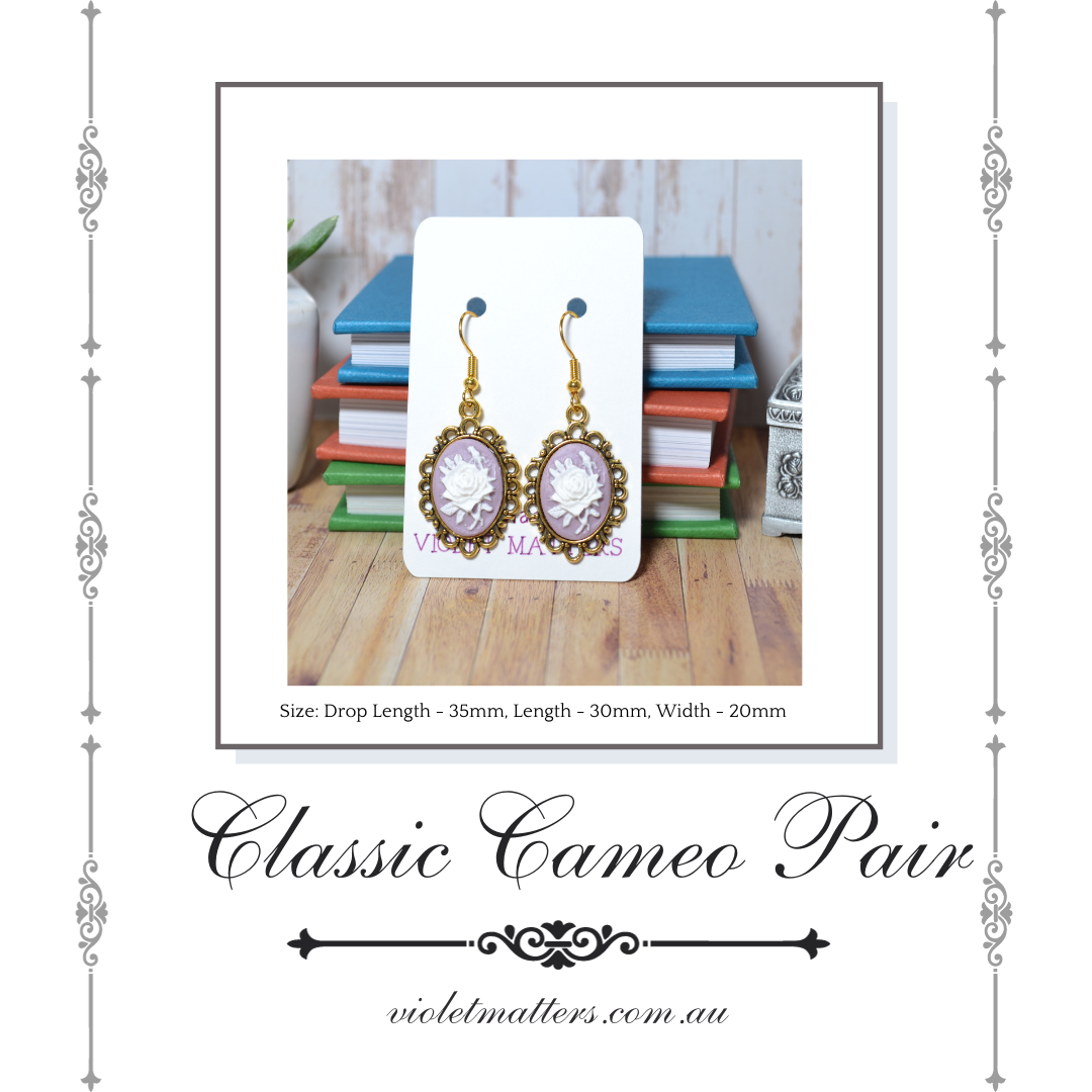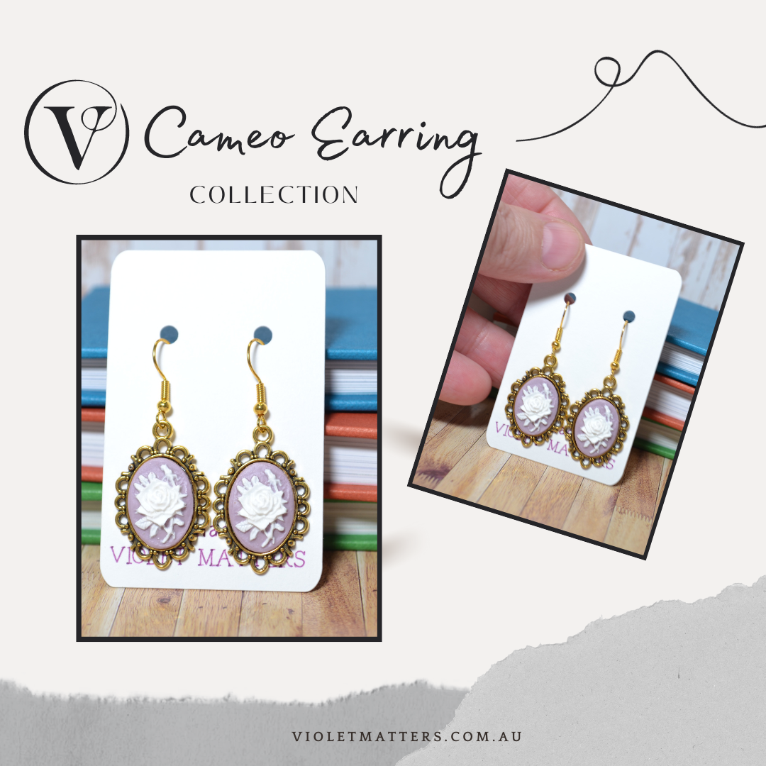These elegant cameo earrings feature a white raised floral rose design on a lilac resin base, beautifully set in a gold-plated frame. A delicate accessory with vintage-inspired charm. Please note, the size provided includes the entire cameo with the gold-plated setting, while the cabochon measures 18x13mm.