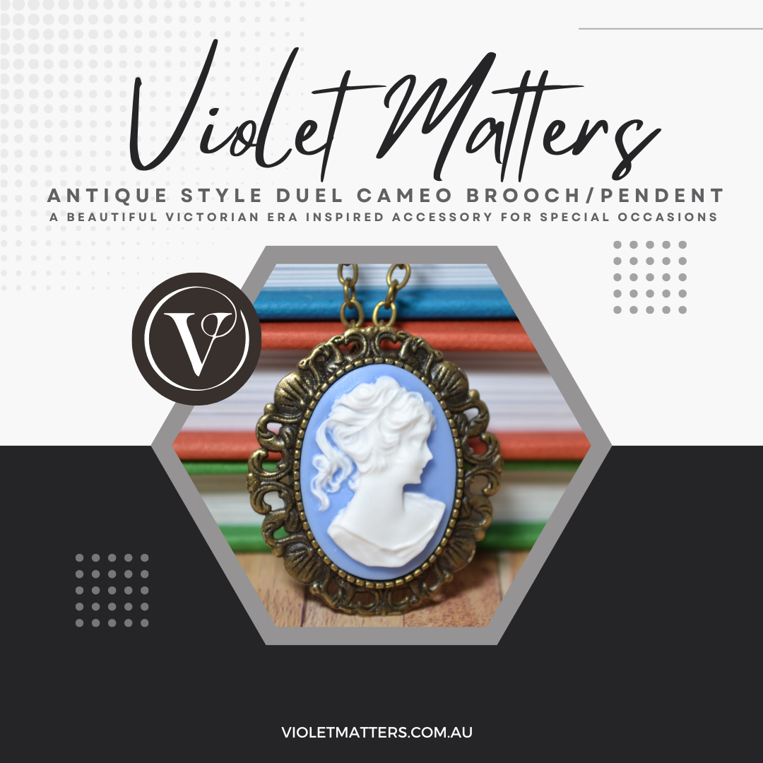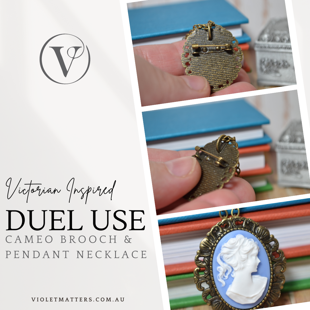 This particular cameo is a fabulous duel piece of jewellery that is both a cameo pendant necklace and a cameo pendant brooch - please refer to the image of the back of the cameo setting - you will see that it has both a brooch pin a large bail for a chain. This cameo brooch comes with a 60cm bronze plated chain as well - a truly versatile piece, It features a raised white lady in profile and has been set on a blue resin setting. I absolutely love this piece and it would make a wonderful addition to your jewellery collection or as a gift for that someone special.