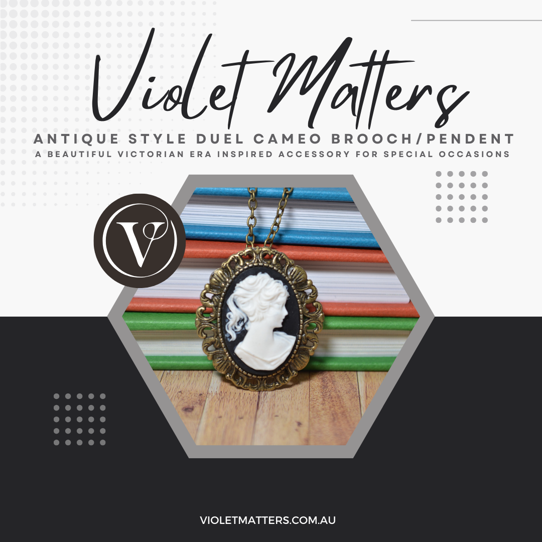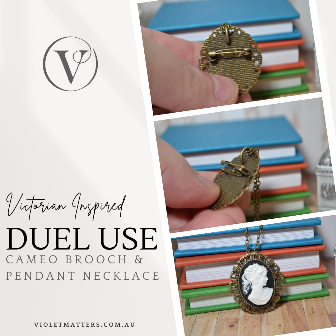 This particular cameo is a fabulous duel piece of jewellery that is both a cameo pendant necklace and a cameo pendant brooch - please refer to the image of the back of the cameo setting - you will see that it has both a brooch pin a large bail for a chain. This cameo brooch comes with a 60cm bronze plated chain as well - a truly versatile piece, It features a raised white lady in profile and has been set on a black resin setting. I absolutely love this piece and it would make a wonderful addition to your jewellery collection or as a gift for that someone special.