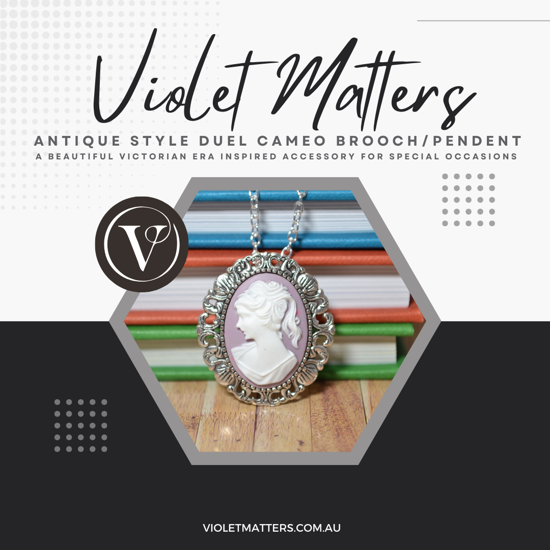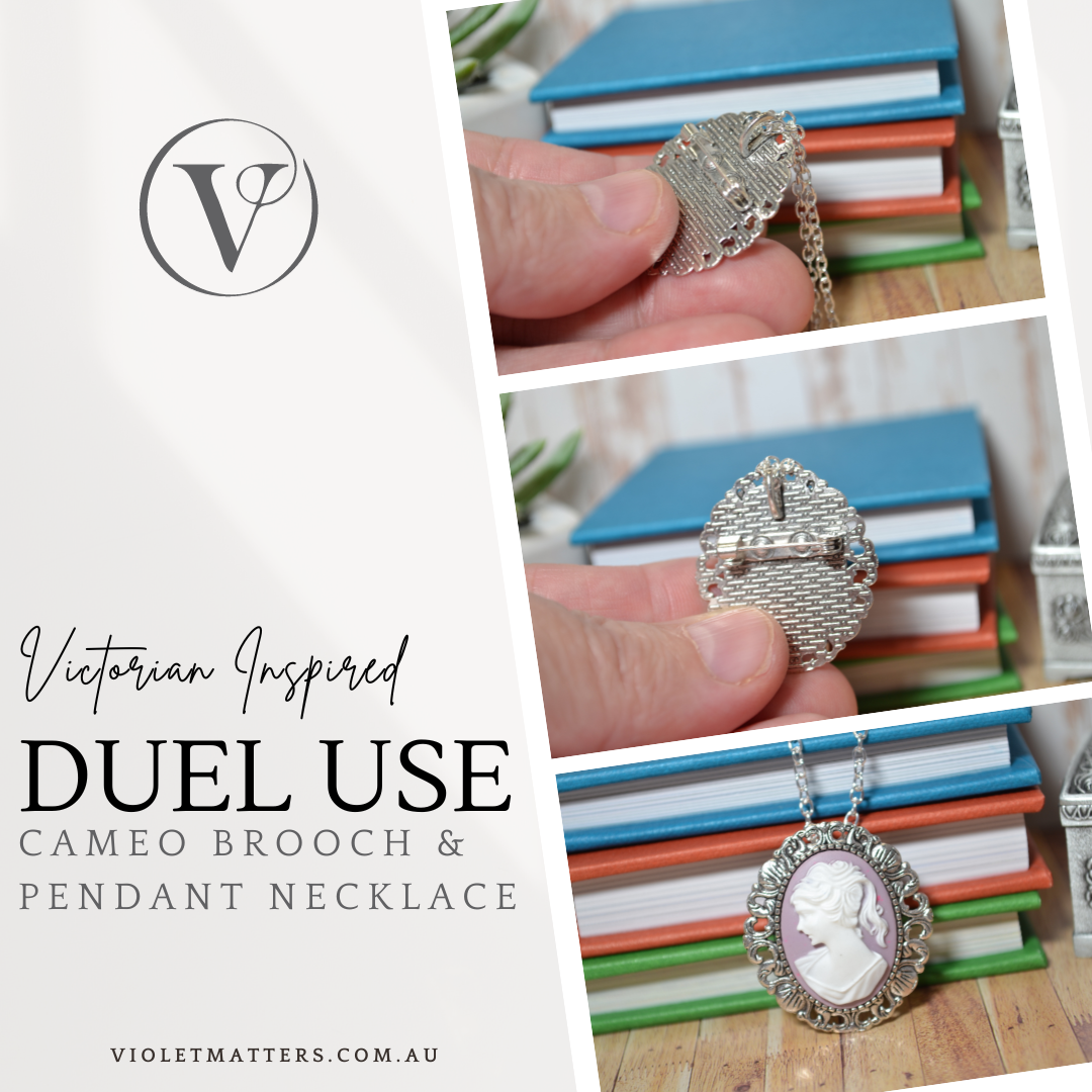 This particular cameo is a fabulous duel piece of jewellery that is both a cameo pendant necklace and a cameo pendant brooch - please refer to the image of the back of the cameo setting - you will see that it has both a brooch pin a large bail for a chain. This cameo brooch comes with a 60cm silver plated chain as well - a truly versatile piece, It features a raised white lady in profile and has been set on a lilac resin setting. I absolutely love this piece and it would make a wonderful addition to your jewellery collection or as a gift for that someone special. Β