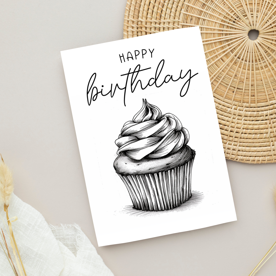 Blank A5 Printable Happy Birthday Cupcake Card - Black & White Printable Card