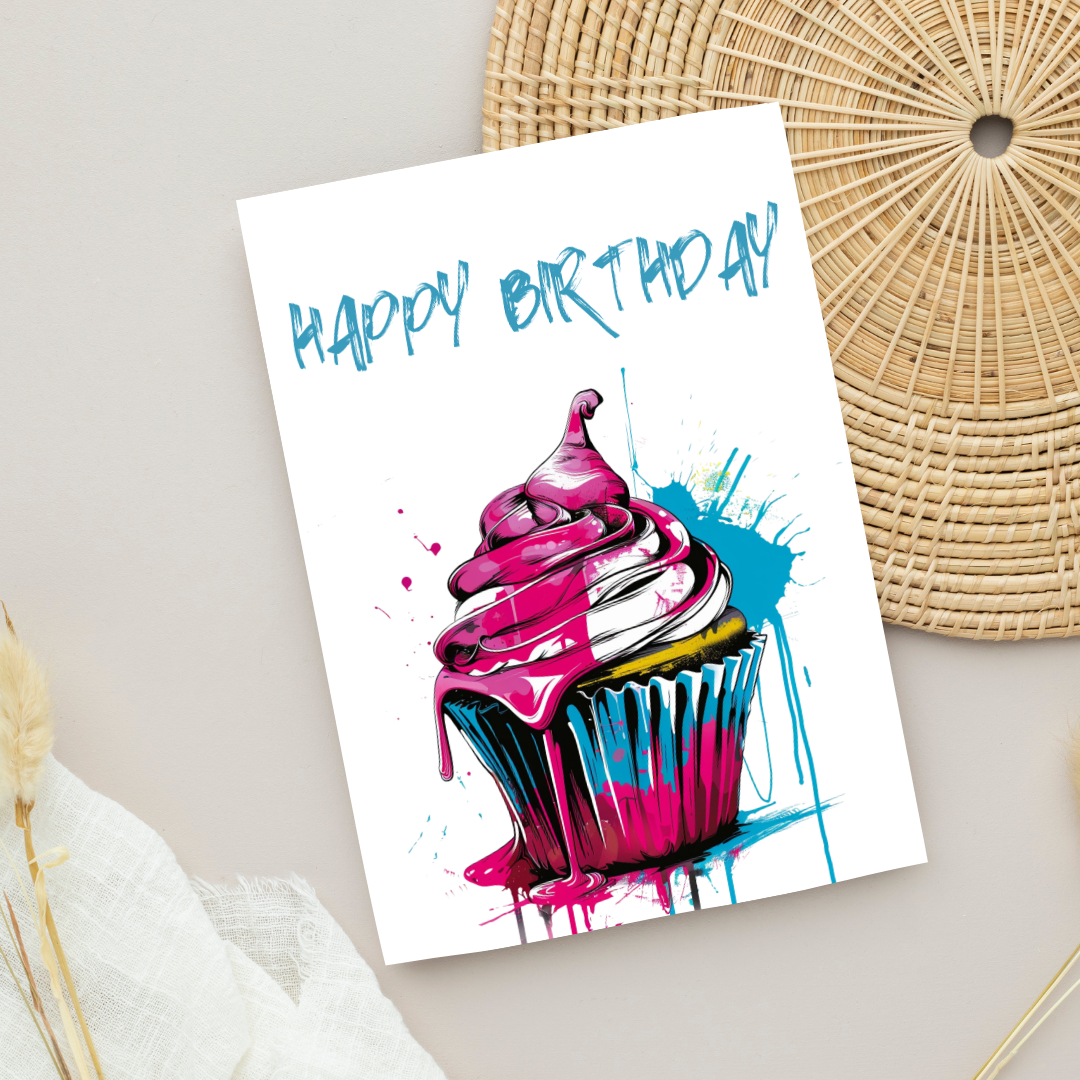 Blank A5 Printable Happy Birthday Cupcake Card - Street Art Inspired Printable Card