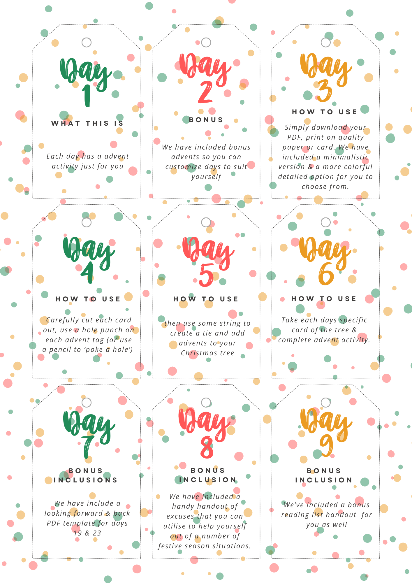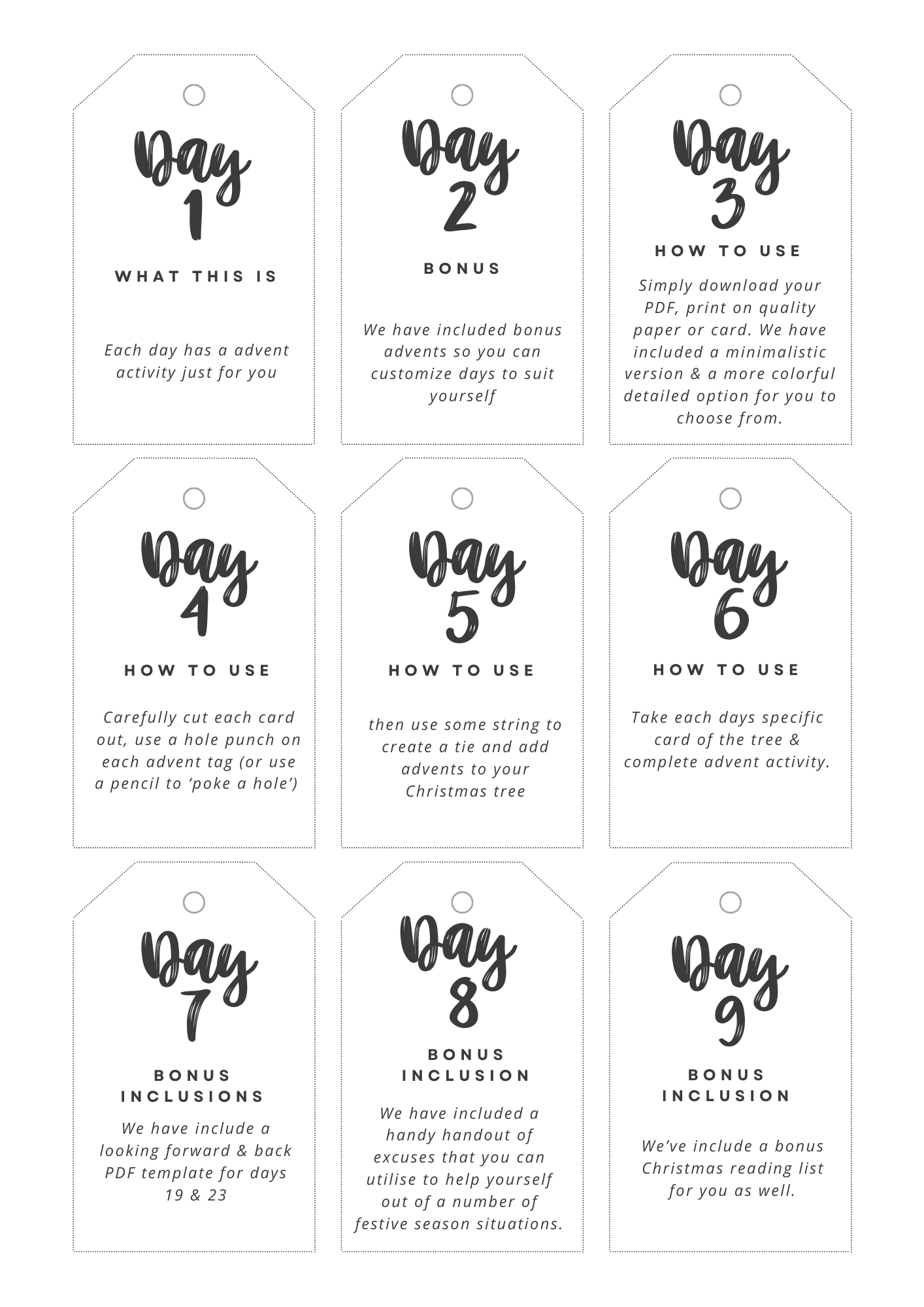 This calendar comes in two distinct versions, catering to your aesthetic preferences. Choose between the elegant black and white minimal style or opt for a vibrant, colorful alternative β both designed with a charming 'Christmas Tag' cutout style. After downloading the Advents, cutting them out and placing them on your tree you will select a tag each day and undertake that day's special activity. It's a wonderful way to create a sense of anticipation and joy throughout the holiday season.