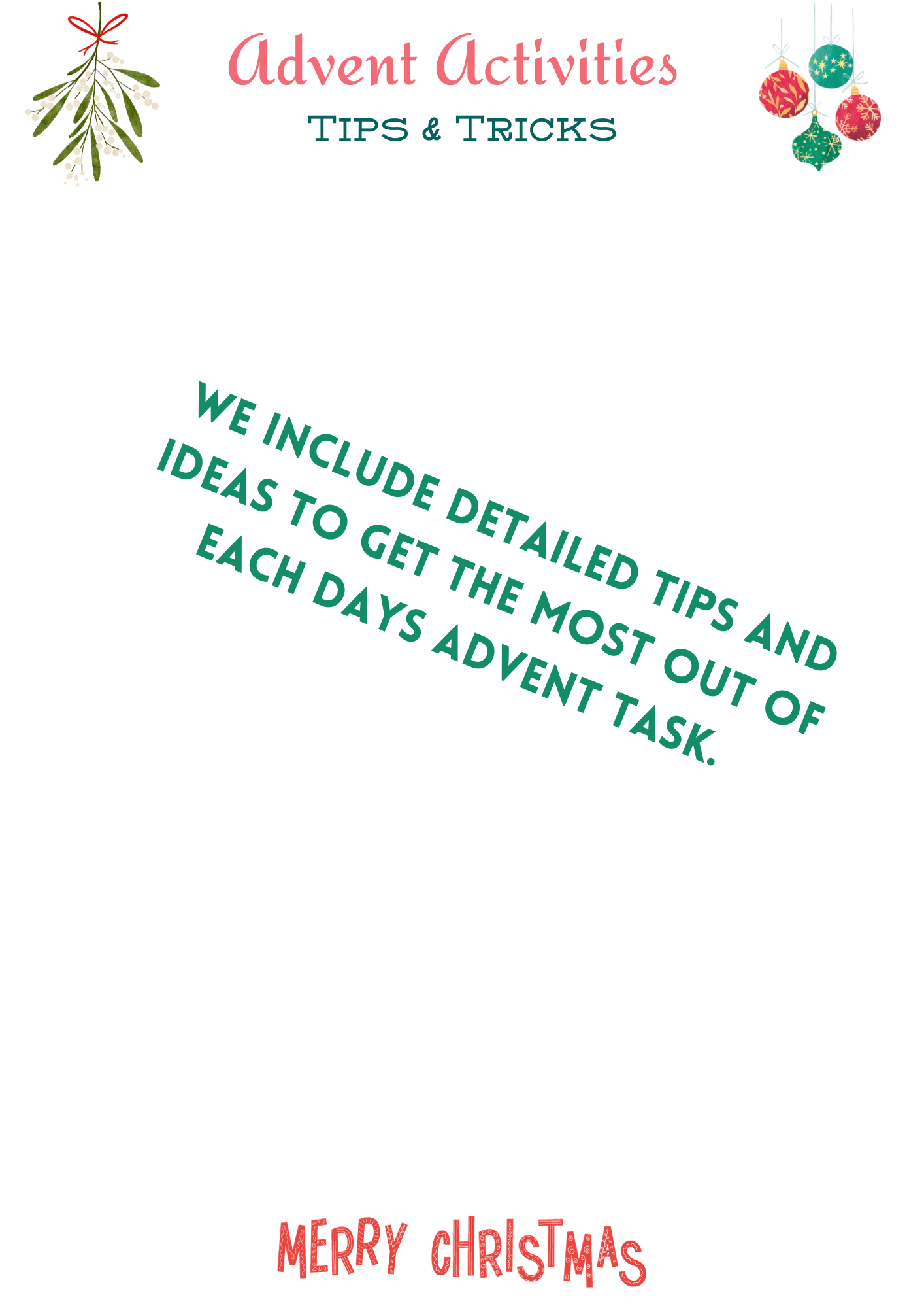 As a special bonus, we've included a variety of attachments to enhance your Christmas experience, including a letter to Santa template, two different thank-you note templates, two coloring pages for endless creativity, a goal and dream setting template and a detailed two-page handout filled with tips and ideas to make the most of this festive advent.