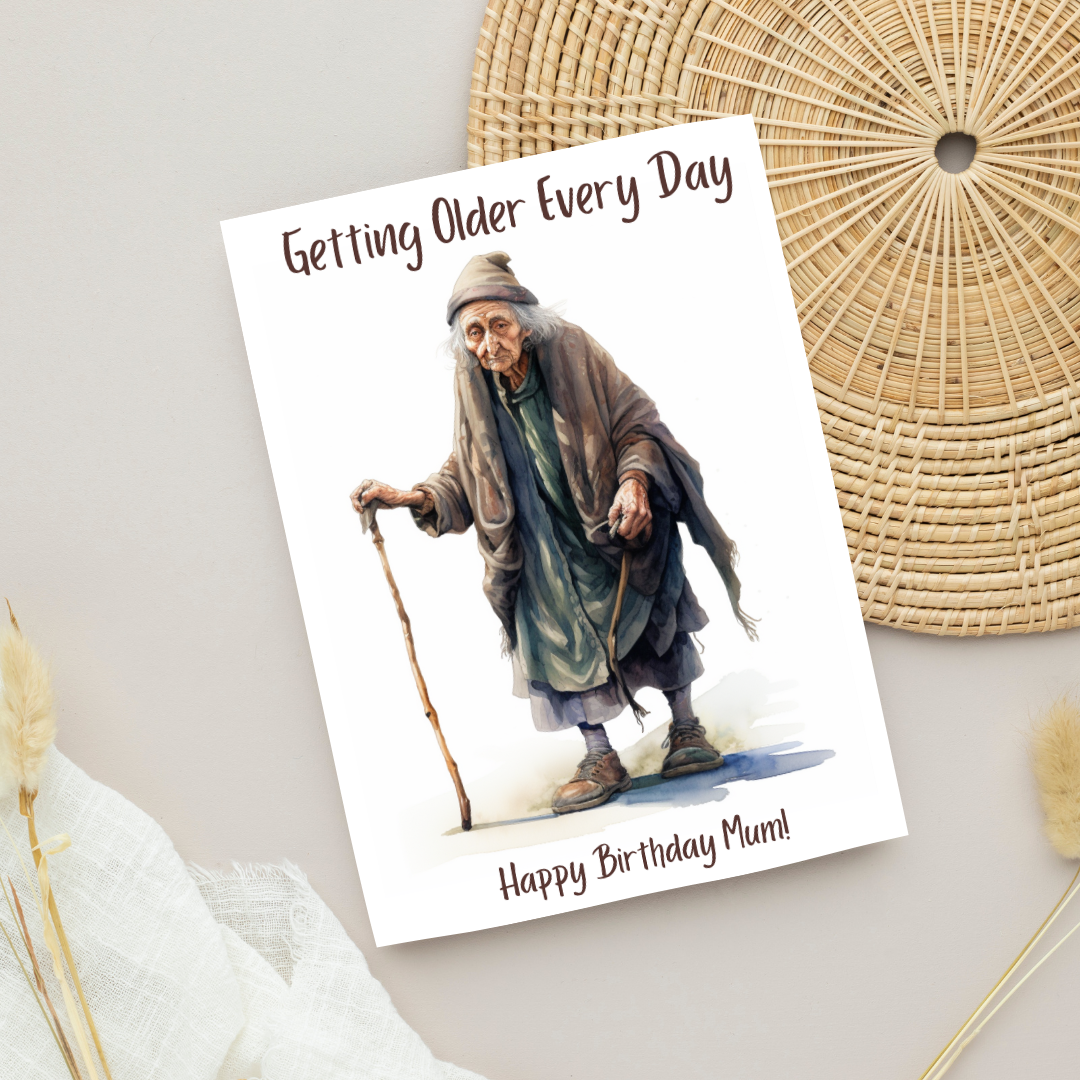 Show mum some love this year with our funny 'Getting Older Every Day' birthday card. This is a printable birthday card for mum that has been designed with value and convenience in mind. After purchase, download, print and you are ready to go. Our printable cards are made using a fusion of cutting-edge AI technology and our imagination and creative visions. Our cards are unique and original images created by us in our Adelaide studio using AI technology.