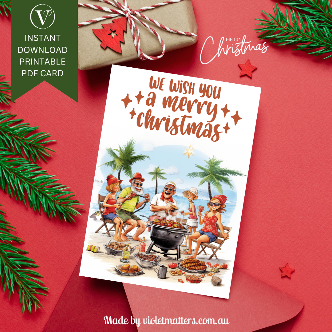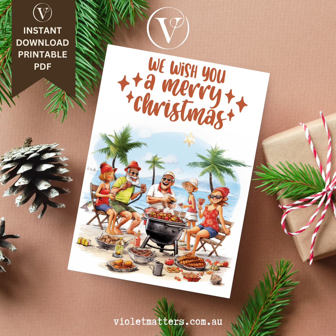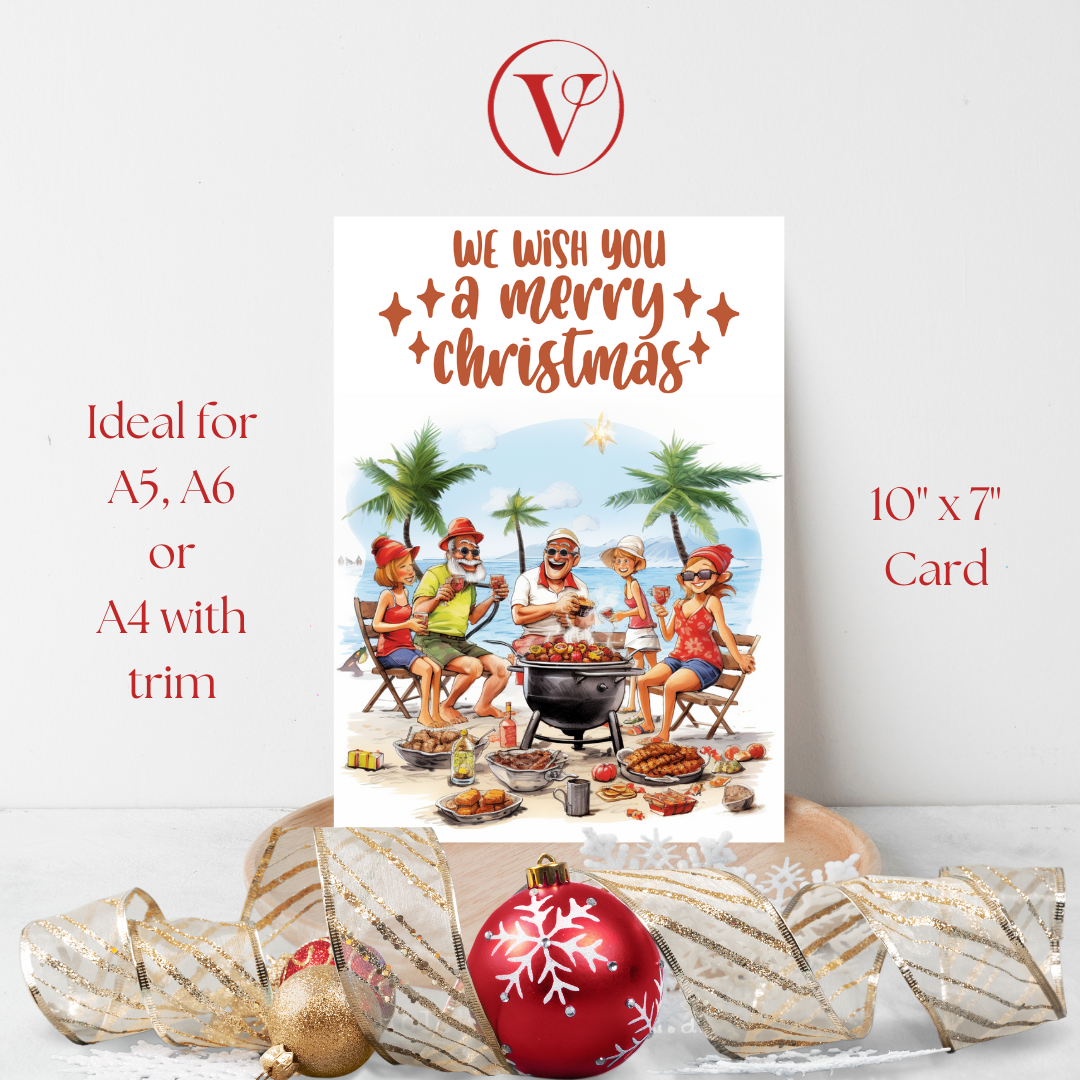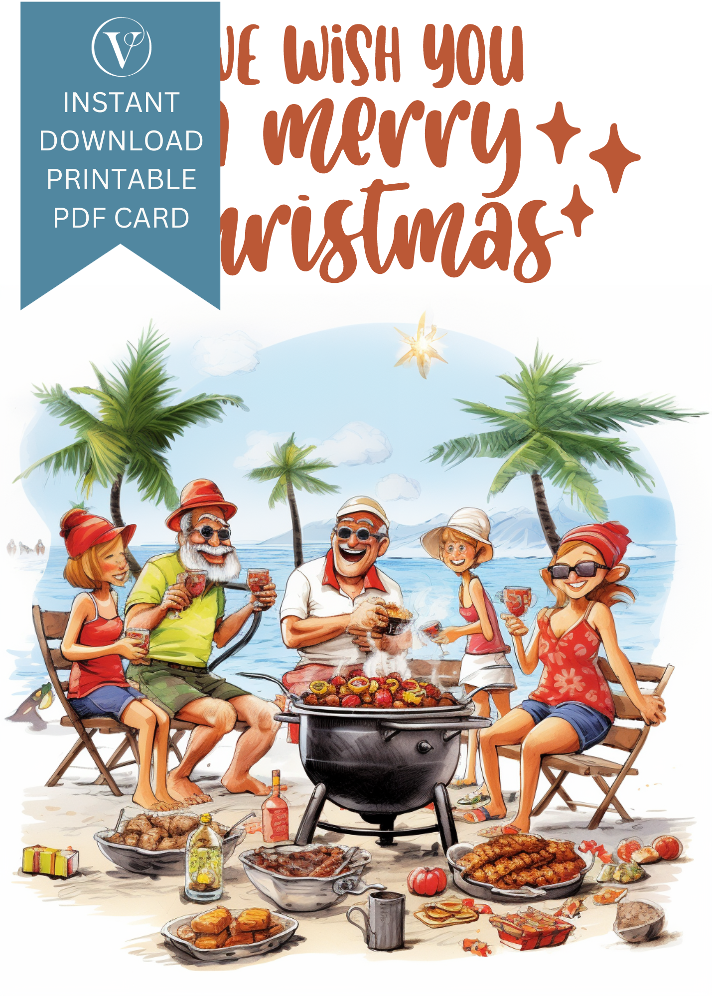 Get ready to infuse the spirit of a true-blue Australian Christmas into your holiday greetings with our unique A5 Printable Christmas Card, a standout from our brand new digital Christmas card collection. This card captures the essence of a scorching Australian summer, with people gathered at the beach, sizzling up a BBQ, and enjoying a few drinks under the sun. Our printable cards have been designed with value and convenience in mind. After purchase, download, print and you are ready to go. Our printable cards are made using a fusion of cutting-edge AI technology and our imagination and creative visions. Our cards are unique and original images created by us in our Adelaide studio. Please do not copy, they are intended for personal use only.